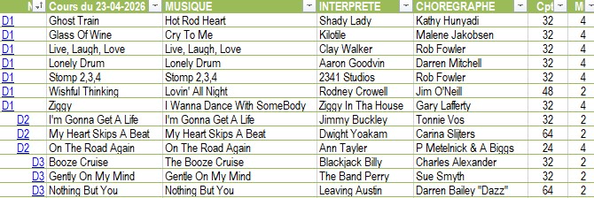 | 1ère HEURE 12-02-2026 A BAR SONG – Vidéo 08-09-2025 ALL AMERICAN PROMENADE (P) – Vidéo 06-10-2025 AUSTIN – Vidéo – Vidéo 09-10-2025 BACK TO THE START – Vidéo 05-03-2026 CANADIAN STOMP – Vidéo 19-03-2026 COASTIN – Vidéo 12-02-2026 COFFEE DAYS AND WHISKEY NIGHTS – Vidéo 08-01-2026 COUNTRY AS CAN BE – Vidéo 11-09-2025 CRI CRI – Vidéo 18-09-2025 EASY DANCE – Vidéo 20-11-2025 FEELING GOOD – Vidéo 05-02-2026 GHOST TRAIN – Vidéo 16-10-2025 GLASS OF WINE – Vidéo 09-10-2025 GO CAT GO – Vidéo 08-01-2026 HANNAH ROAD – Vidéo 11-09-2025 HEYDAY TONIGHT – Vidéo 05-03-2026 HOEDOWN – Vidéo 12-02-2026 JUST DANCE 567 – Vidéo 08-01-2026 LIVE, LAUGH, LOVE – Vidéo 06-11-2025 LONELY DRUM – Vidéo 04-12-2025 LOVE POTION – Vidéo 16-10-2025 LUCKY LIPS – Vidéo 12-03-2026 MADE IN MEXICO – Vidéo 25-09-2025 MILEY’S FLOWERS – Vidéo 25-09-2025 NOTHING LIKE THIS – Vidéo 12-03-2026 READY FOR IT – Vidéo 15-01-2026 RED HOT SALSA – Vidéo 13-11-2025 RIDIN’ – Vidéo 20-11-2025 SIXTEEN STEP – Vidéo 19-03-2026 SPEAK TO THE SKY – Vidéo 02-10-2025 STAND BY ME – Vidéo 22-01-2026 STOMP 2, 3, 4 – Vidéo 20-11-2025 STRAY CAT STRUT – Vidéo 23-10-2025 SUMMERFLY – Vidéo 05-03-2026 THANKS A LOT – Vidéo 11-09-2025 THAT’S CHEATING – Vidéo 11-09-2025 THE MORNING AFTER – Vidéo 08-01-2026 THINKIN’ COUNTRY – Vidéo 05-03-2026 WE’RE GOOD TO GO – Vidéo 04-12-2025 WINGS TO FLY – Vidéo |